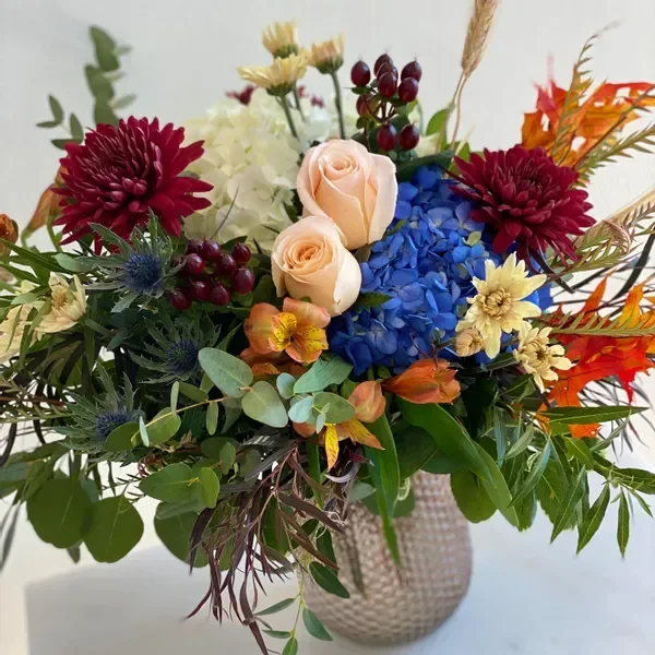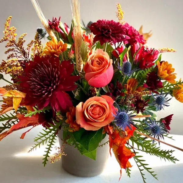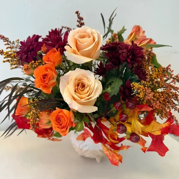 Bring the warmth of fall indoors with the rich palette of our Leaf arrangement, all set in a darling footed pot. Accented with seasonal foliage and berries, it's the perfect piece to celebrate the beauty of the season.